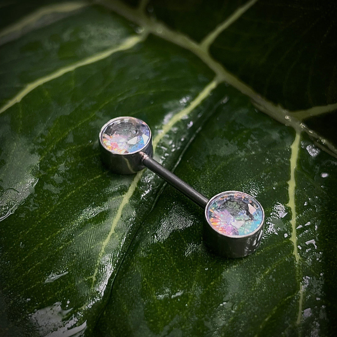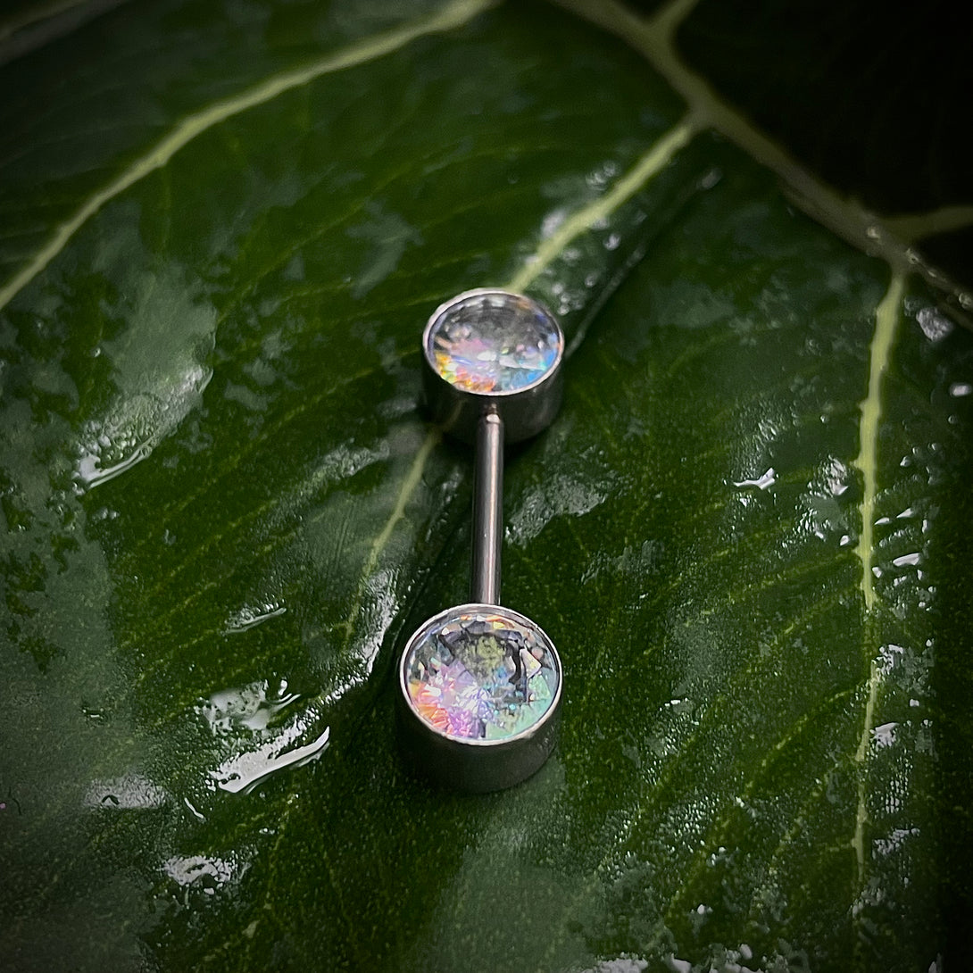 Esta joya única de piercing de pezón destaca por su diseño encantador y las bolitas que reflejan una paleta de tonalidades tornasol, creando un efecto visual cautivador.