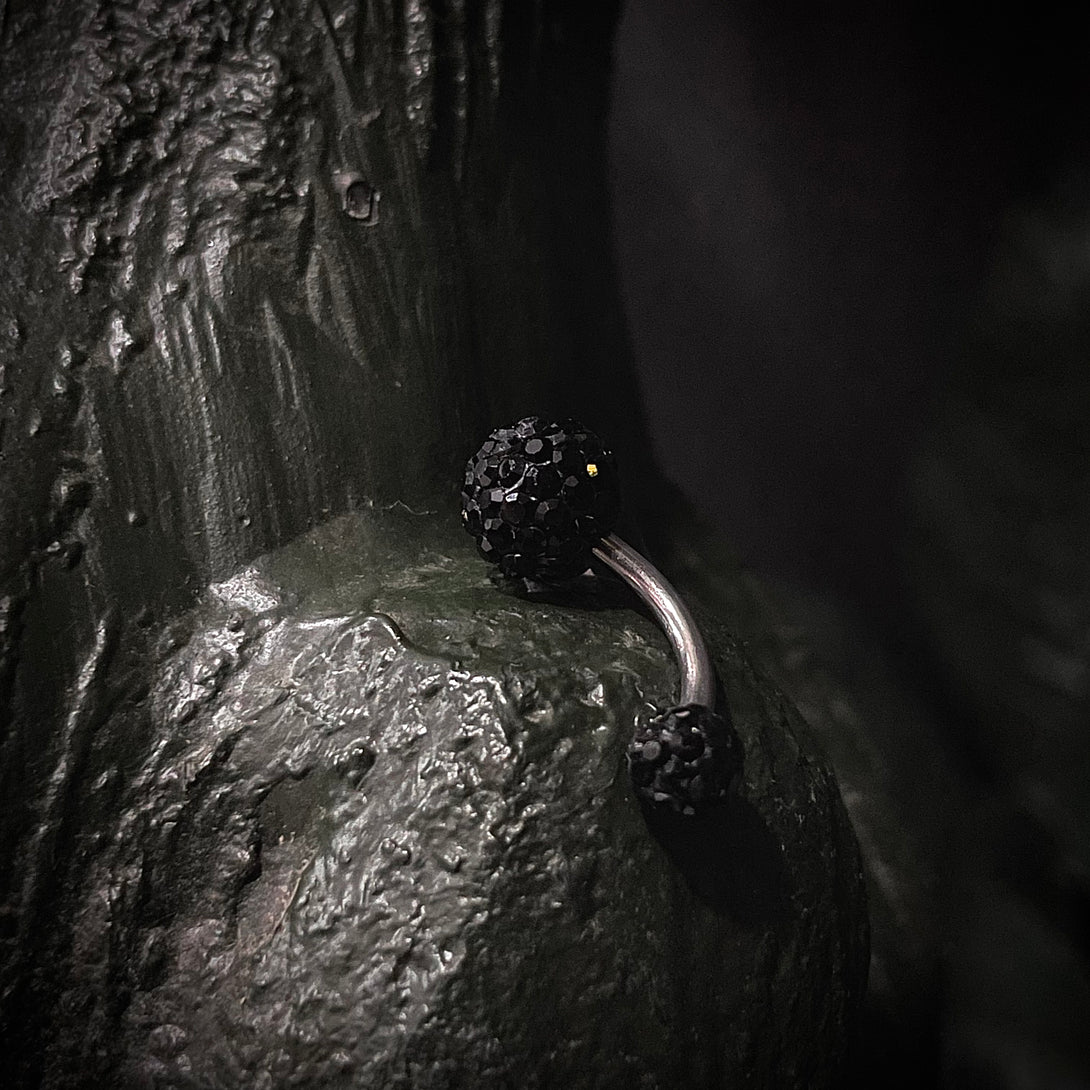La bolita negra destellante en esta joyería para ombligo aporta un elemento visual llamativo y elegante. Fabricada con materiales de alta calidad, esta pieza no solo es estilizada sino también cómoda y segura para un uso diario.