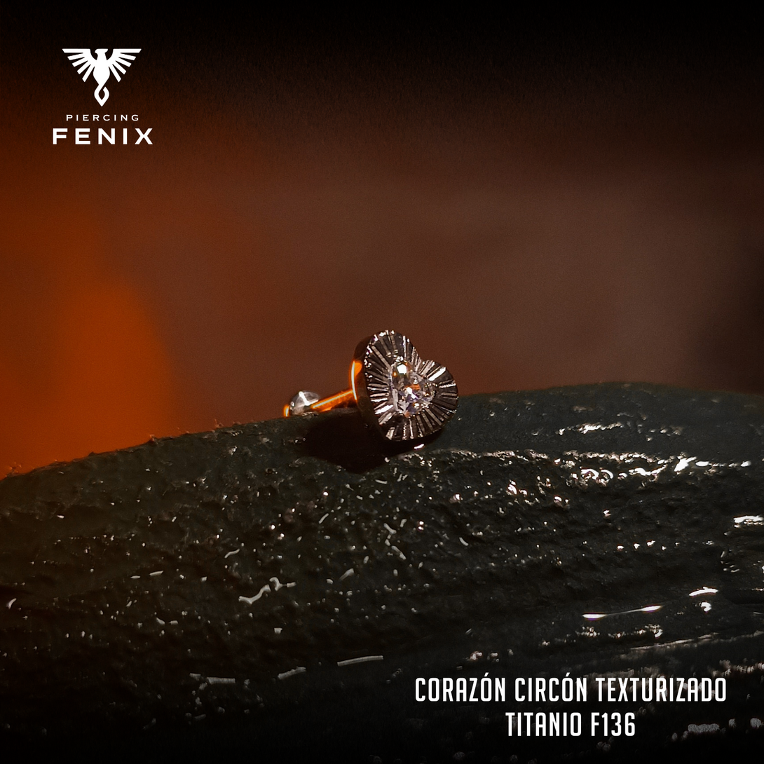 Explora la belleza única de nuestra Exclusiva Joya "Corazón Circón Texturizada" en Titanio F136. Esta pieza singular destaca por su diseño floral con textura, añadiendo un toque distintivo y elegante a tu perforación.