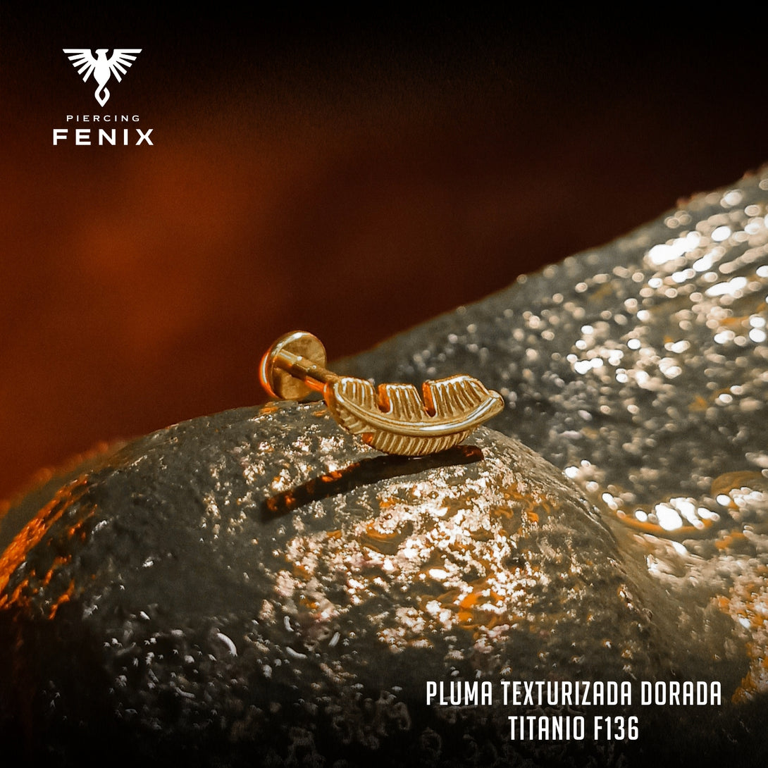 Deslumbra con nuestra Exclusiva Joya "Pluma Texturizada Dorada" en Titanio F136. Esta pieza única destaca por su diseño elegante y la presencia de una pluma texturizada en tono dorado, añadiendo un toque de sofisticación y glamour a tu estilo.